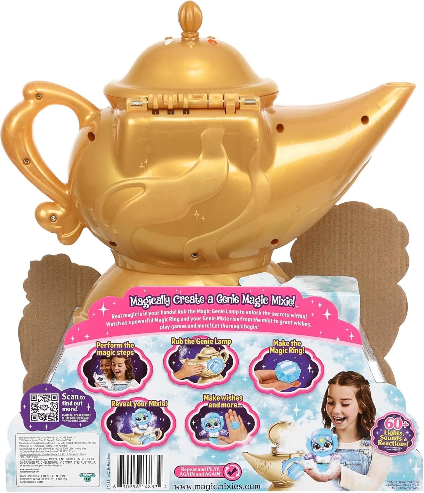 La magia real ha vuelto en forma de la lámpara Magic Mixies Magic Genie Dentro de esta misteriosa lámpara mágica dorada hay un Genie Mixie azul esperando ser lanzado Es hora de que tu hijo realice los pasos mágicos y haga que la magia real suceda con esta lámpara mágica llena de funciones con más de 60 luces, sonidos y reacciones diferentes. Primero tienen que despertar al genio y crear un anillo mágico que se oculta dentro. A medida que tu hijo frota la lámpara, aparece una niebla mágica real de la boquilla y su gema se ilumina. A los niños les encantará interactuar con el divertido Genie Mixie mientras descubren y desbloquean los secretos de la lámpara. Una vez que se cumplan todos los desafíos, el Genie Mixie azul se levantará mágicamente de la lámpara. ¡Elimina tu lindo genio de peluche azul interactivo! La magia y la diversión acaban de comenzar. Cuando el Genie Mixie se retira de la lámpara, los niños pueden utilizar el anillo mágico para interactuar con su Mixie. Una vez que tu hijo nombra a su genio, puede jugar usando los 3 modos diferentes del genio: modo de concesión de deseos, modo de reproducción y modo de chat. Al usar su gema iluminada en su frente, el Genie Mixie puede otorgar o negar los deseos de los niños y mucho más. ¿A quién crearás mágicamente con la lámpara Magic Mixies Genie?