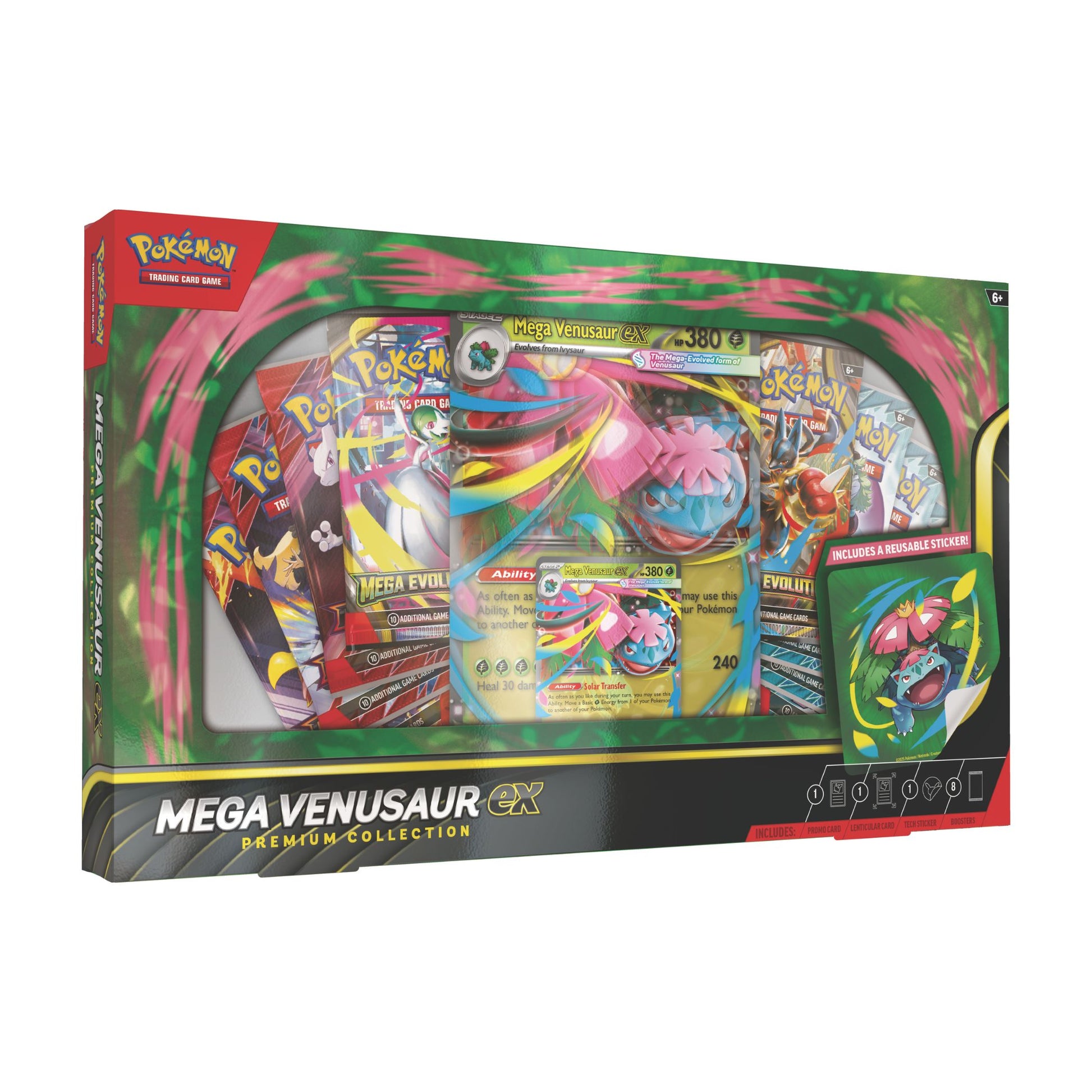La Colección Prémium Mega-Venusaur ex de JCC Pokémon contiene: • 1 carta promo holográfica de Mega-Venusaur ex • 1 carta promo lenticular jumbo de Mega-Venusaur ex • 1 calcomanía para dispositivos de Mega-Venusaur • 8 sobres de refuerzo de JCC Pokémon.