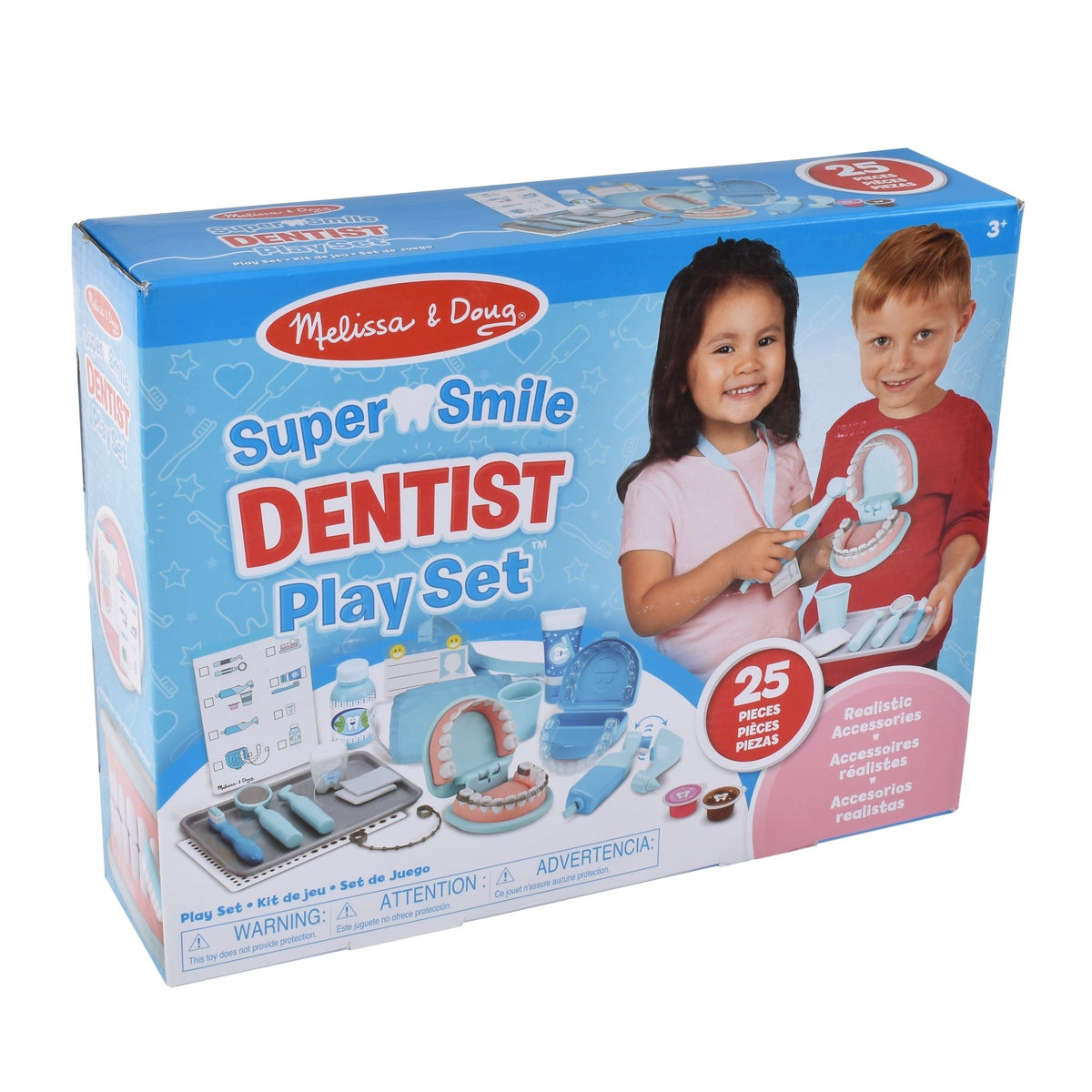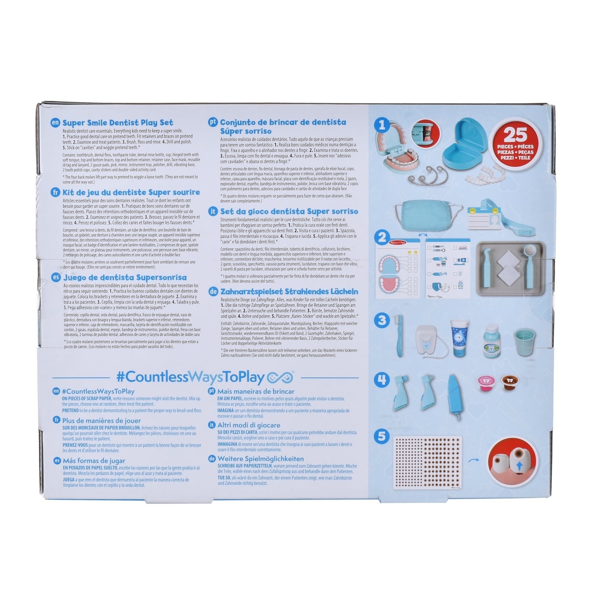 ¡Conviértete en un dentista experto con el Set de Juego Dentista Melissa & Doug! Este set incluye 25 piezas con todos los elementos esenciales para cuidar los dientes: un juego de dientes de juguete, stickers de caries, herramientas de examen, cepillo y pasta dental, enjuague, gasas, vasos de pulido, retenedores y brackets, mascarilla, identificación reutilizable y tarjeta de actividades. Usa la herramienta vibradora con cabezales intercambiables para pulir y limpiar, cepilla los dientes y practica extracciones con los dientes que se mueven. Marca las caries, coloca los brackets o los retenedores y crea tu propia clínica dental. ¡Aprende hábitos de higiene dental mientras juegas, inventas historias y te diviertes cuidando la sonrisa de tus pacientes! ¡Juega con Melissa & Doug!